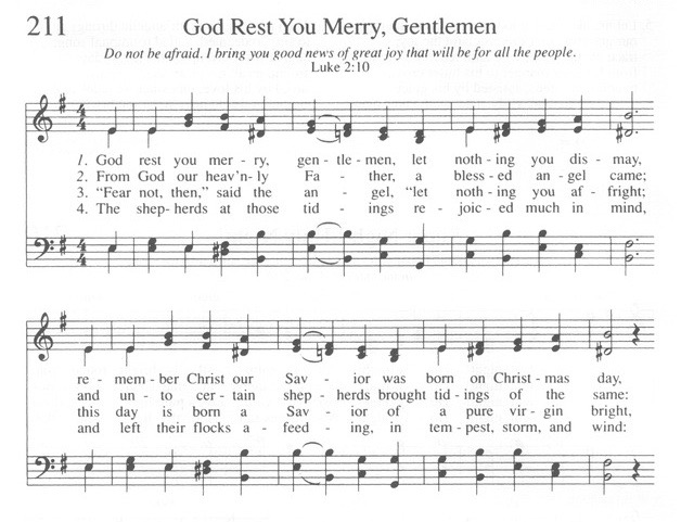 Hymnologists are not sure who wrote this carol, but they tell us that it is based on a English melody written in the 18th century. For many of us, the words and music conjure up images of Victorian gentlemen and ladies appropriately enjoying the yuletide, or a large (somewhat tipsy) Englishman, tankard in hand, singing his lungs out. After all, the carol is about happiness and joy, right? Yes and no.